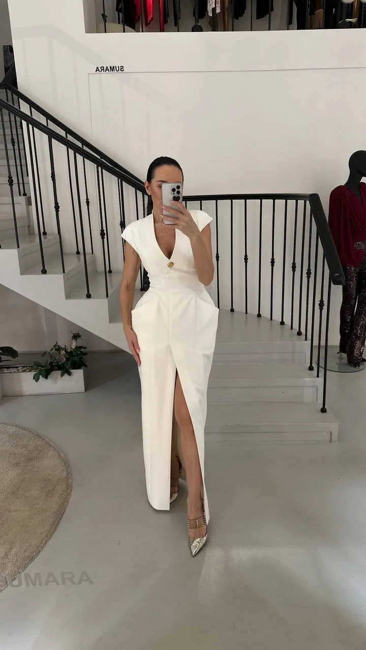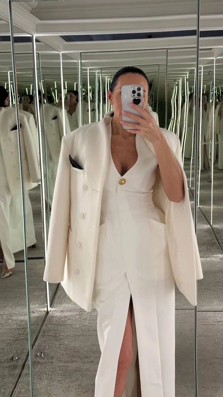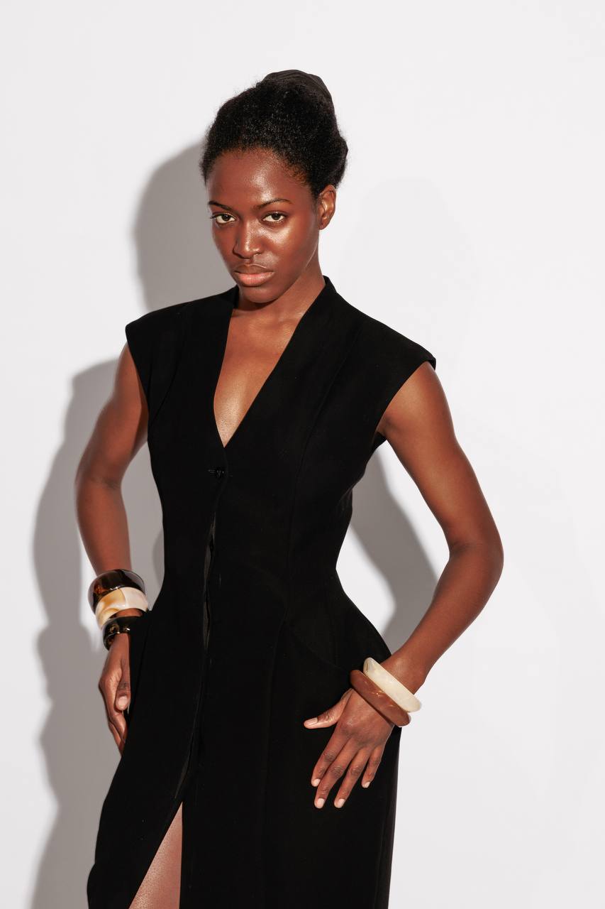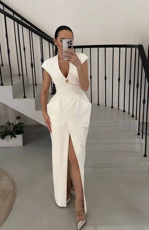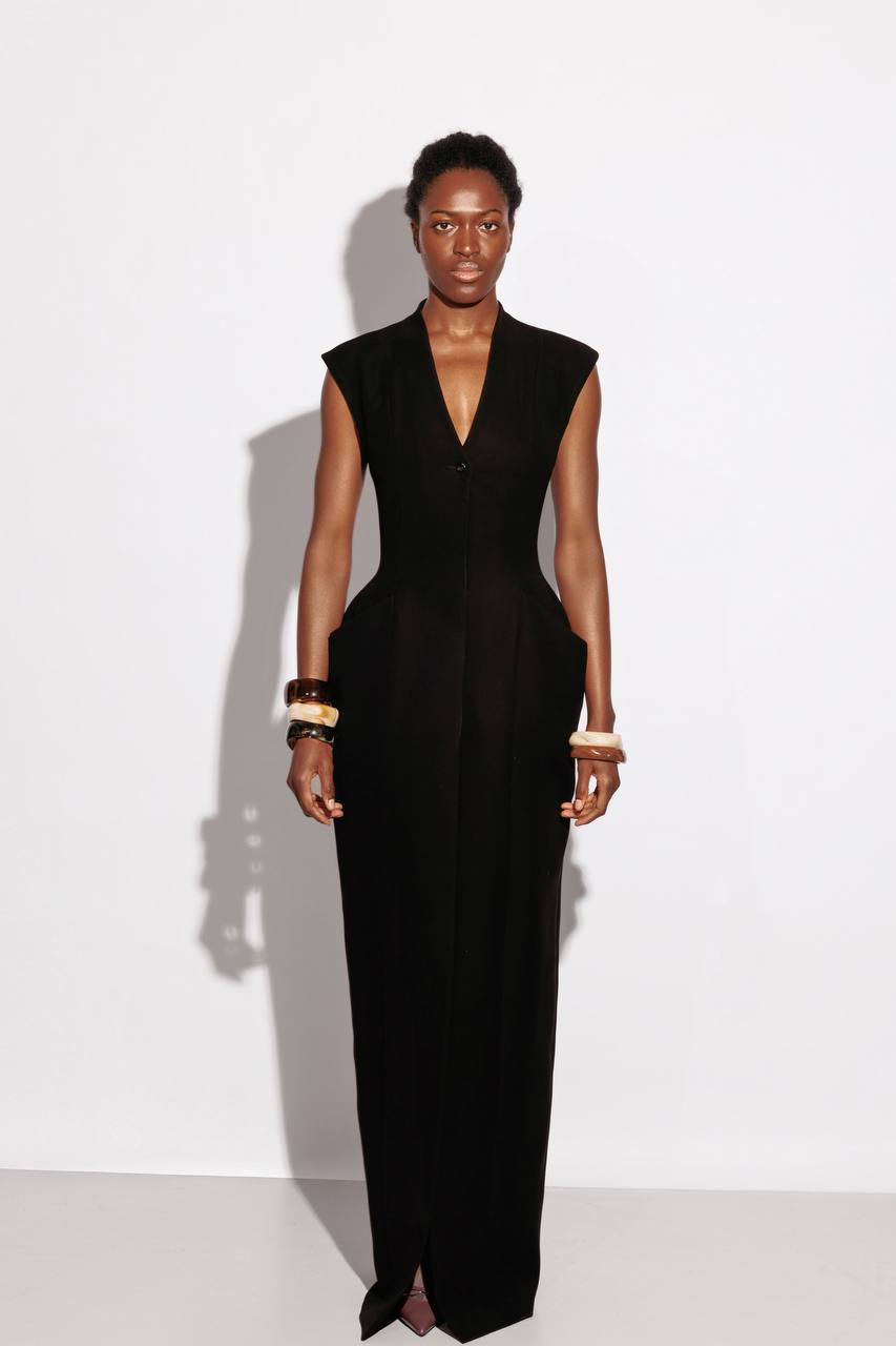 Платье с архитектурным акцентом на линии бёдер и глубоким вырезом — баланс между строгой формой и выразительной женственностью.