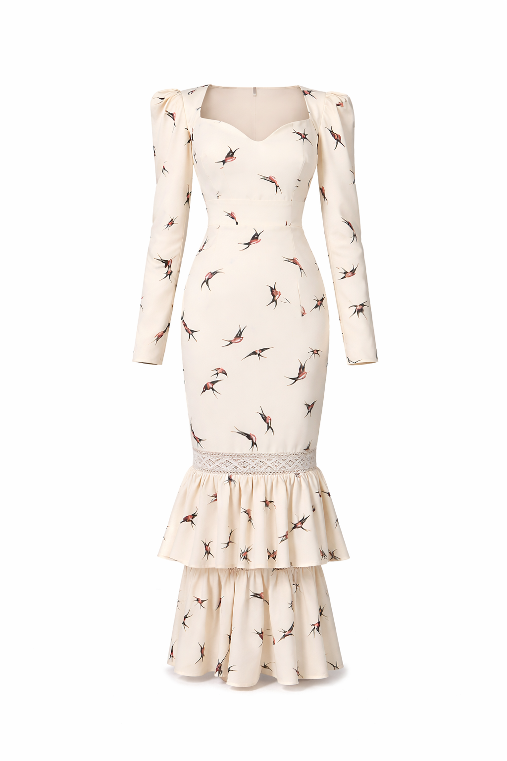 Шёлковое платье макси с открытым декольте и плавными воланами. Авторский принт «Птицы» придаёт изделию динамику и утончённость, делая его идеальным выбором для вечерних и коктейльных образов.